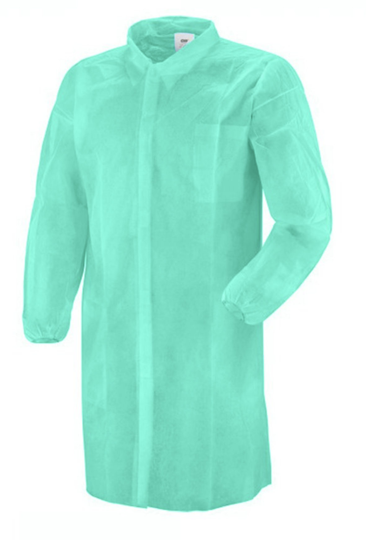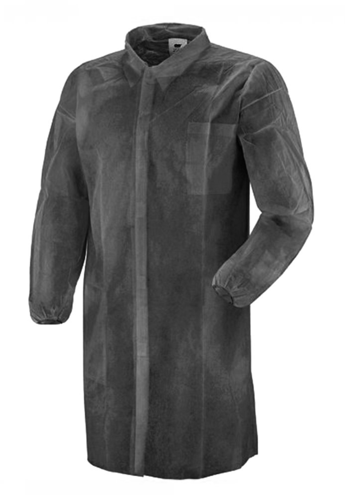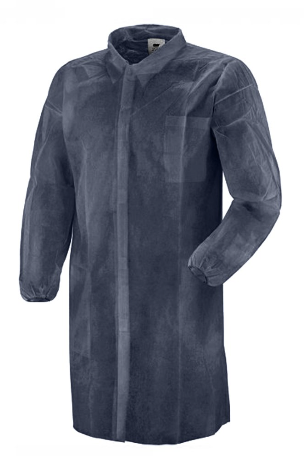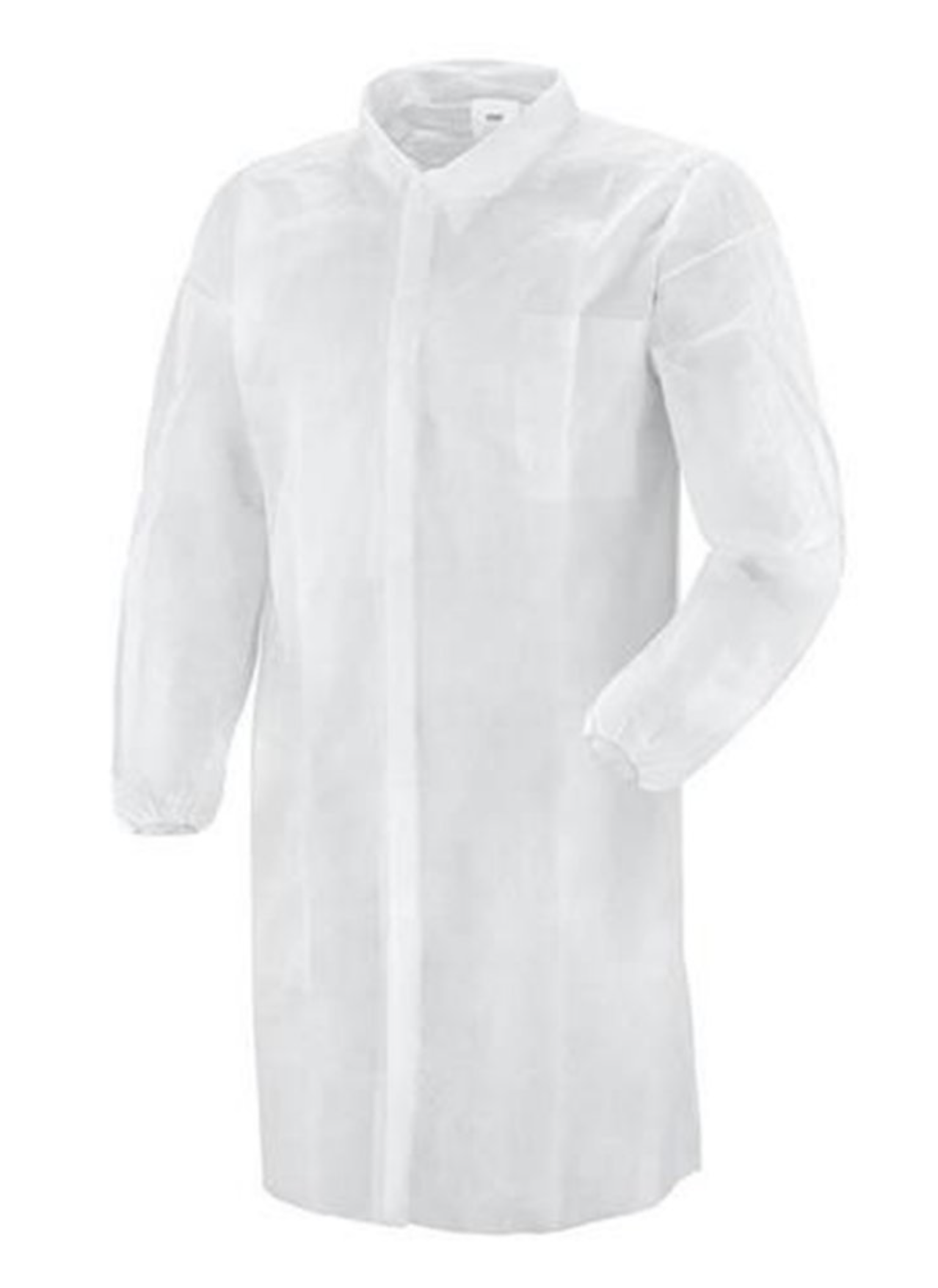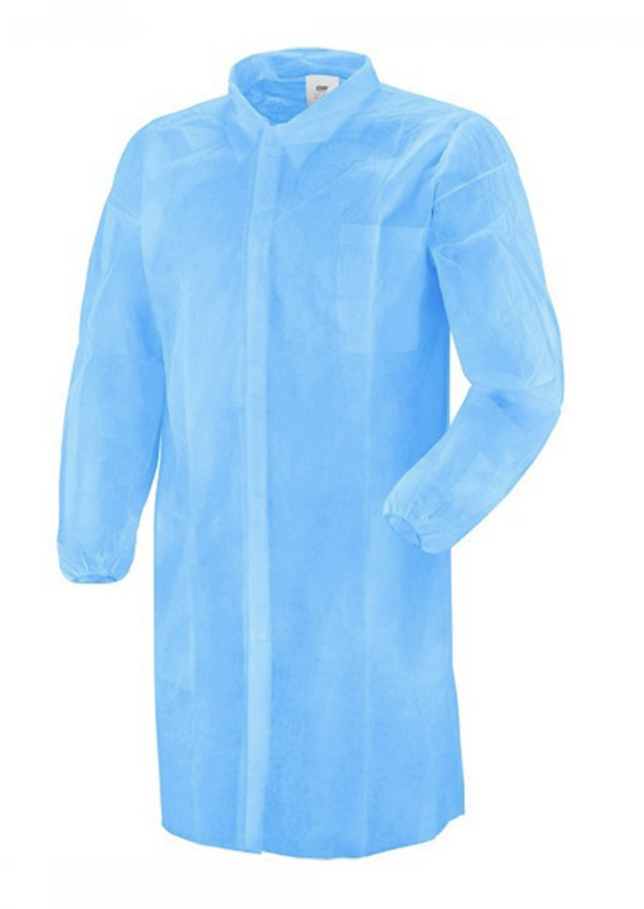 Bata de protección desechable de «tejido no tejido», con puños ajustables con elásticos y cierre de gacho y bucle en la parte delantera. Caja de 50 unidades envasadas en bolsas individuales.