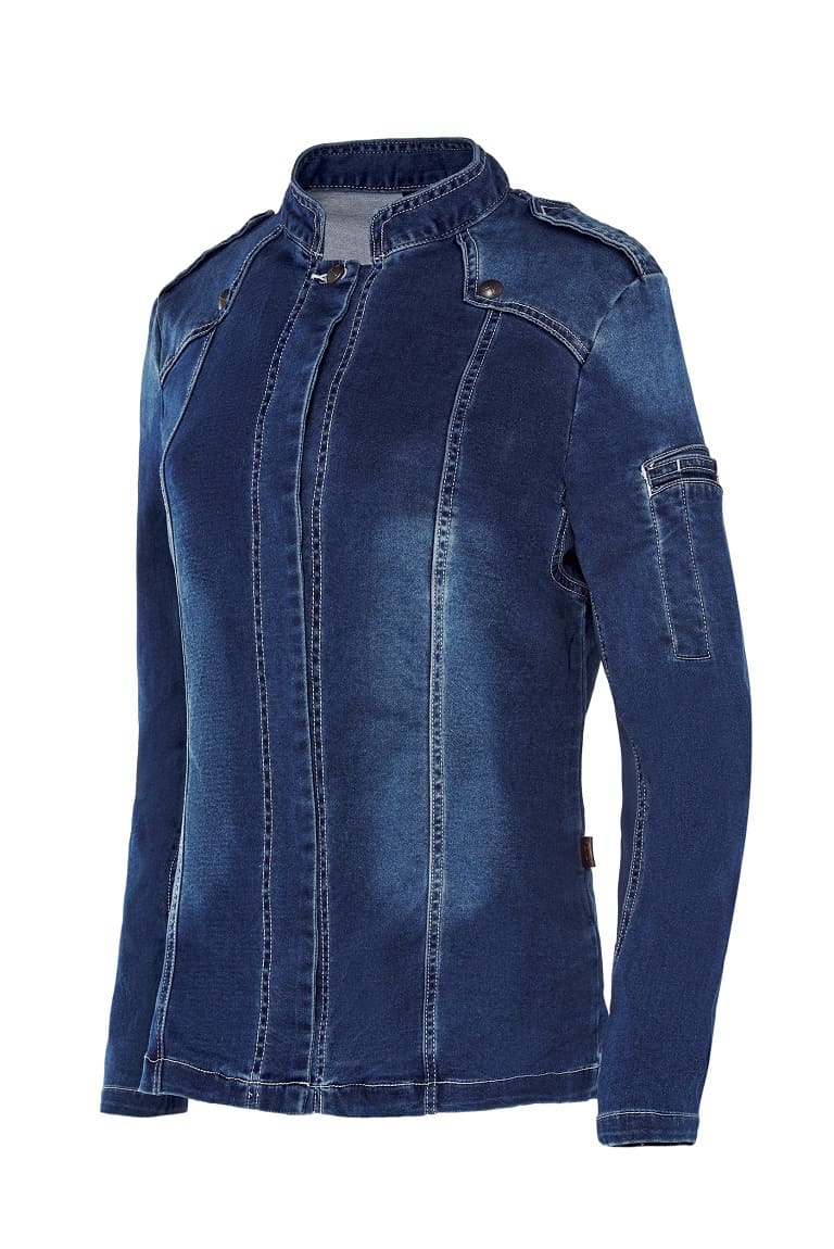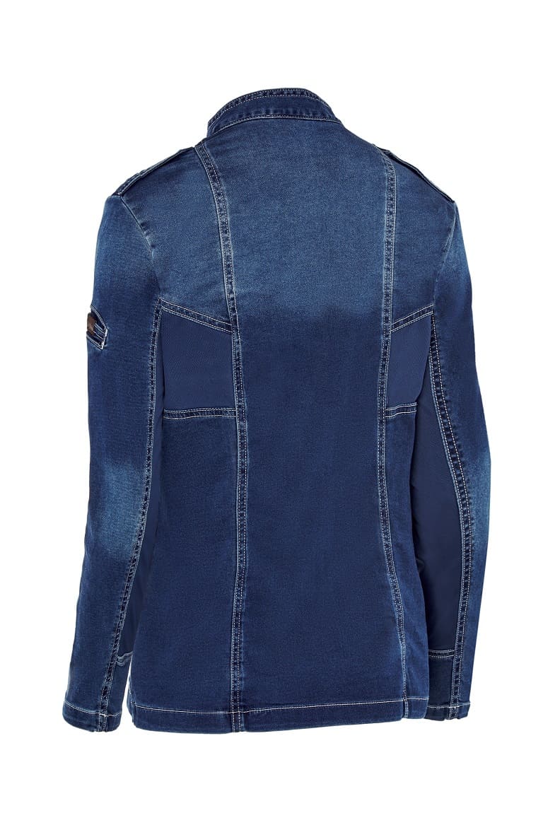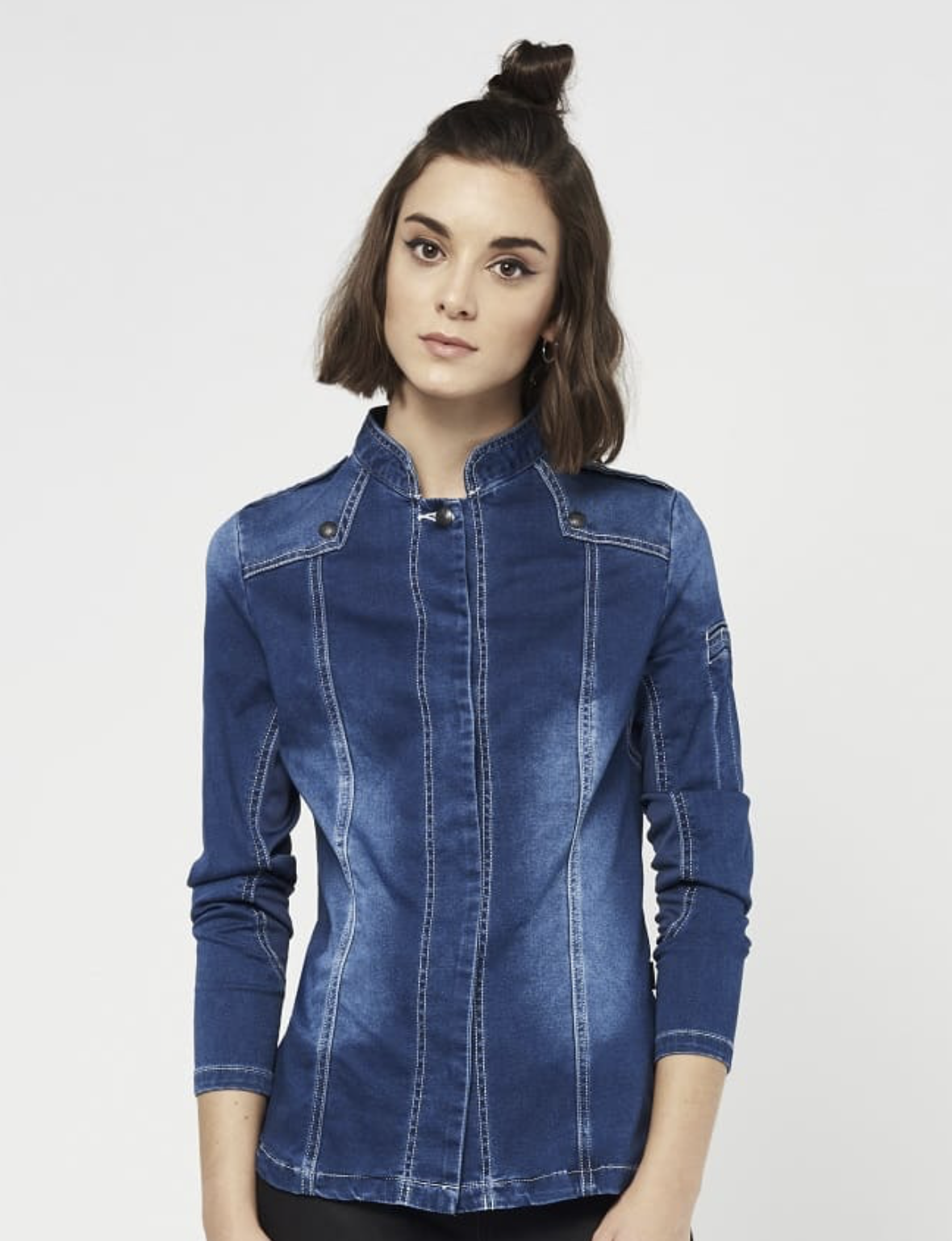 Confeccionada en punto denim azul combinado con tejido de malla en mangas y espalda, esta chaquetilla es especialmente elástica y tiene un corte entallado que realza la silueta. Detalles como el cuello mao subido, los cortes en el delantero y los galones en los hombros como elementos extraídos directamente de la moda army.
