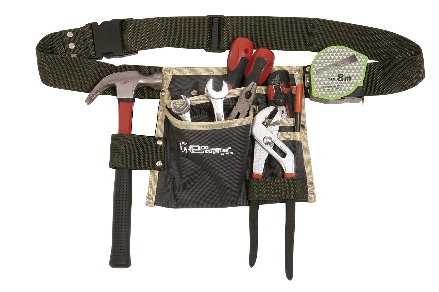 Portaherramientas con 5 bolsillos de tamaño variable con banda portaherramientas y clip metálico para metro.