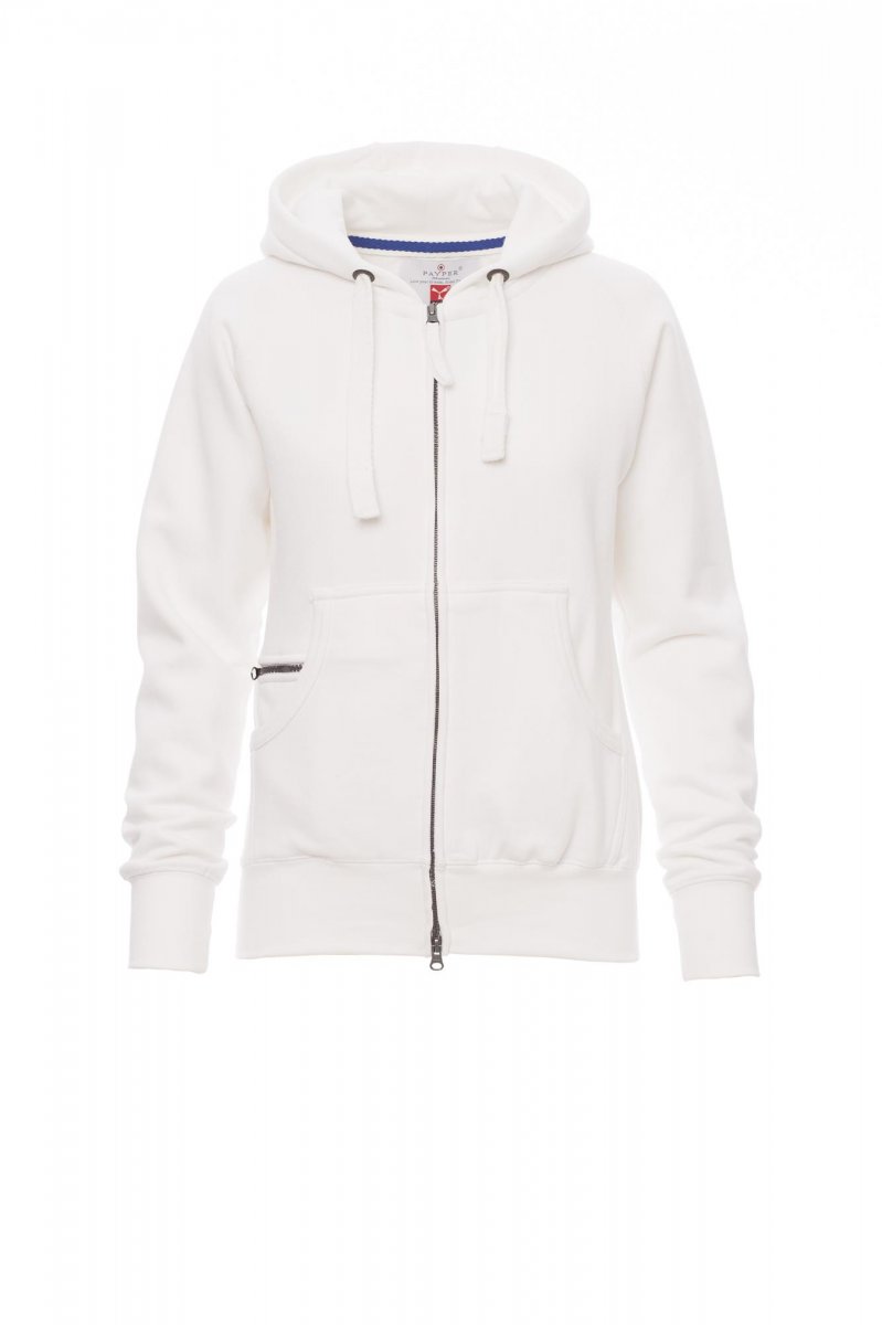 Sudadera ceñida con capucha para mujer con cremallera SBS completa de plástico cubierta y doble tirador metálico, capucha con doble costura y cordón blanco con puntadas y aros metálicos de contraste, mangas ranglán, bolsillos canguro, pequeño bolsillo con cremallera, puños y dobladillo elásticos, costuras reforzadas.