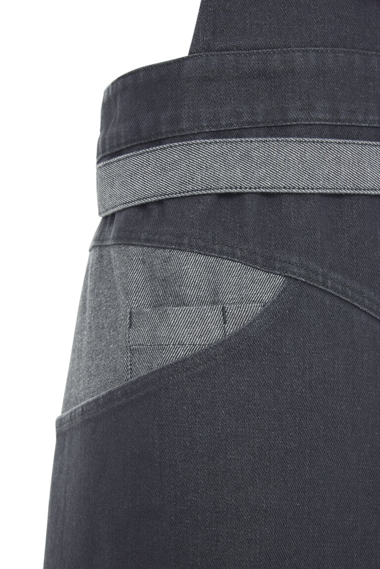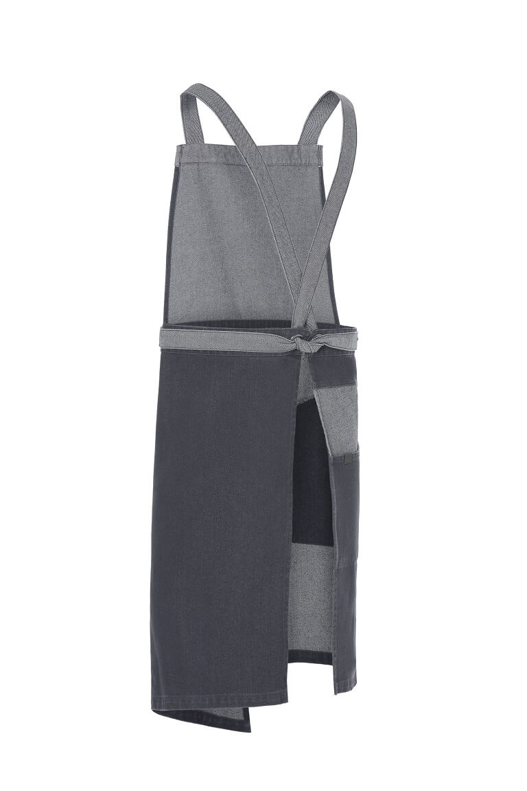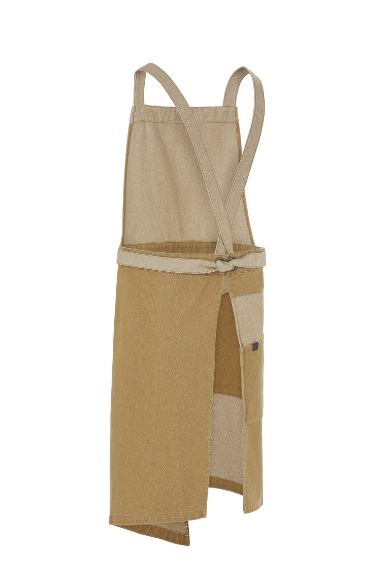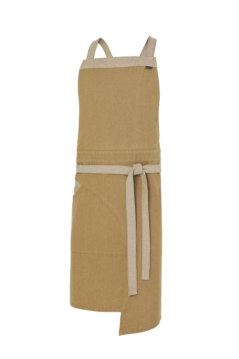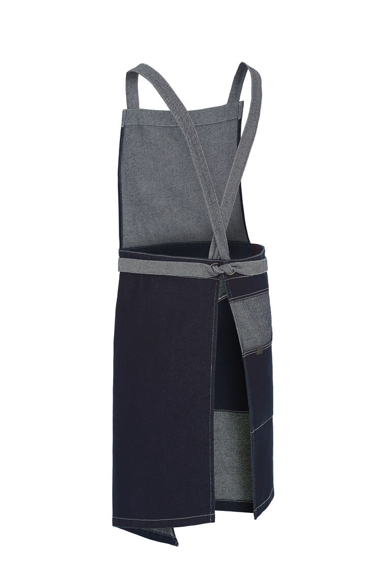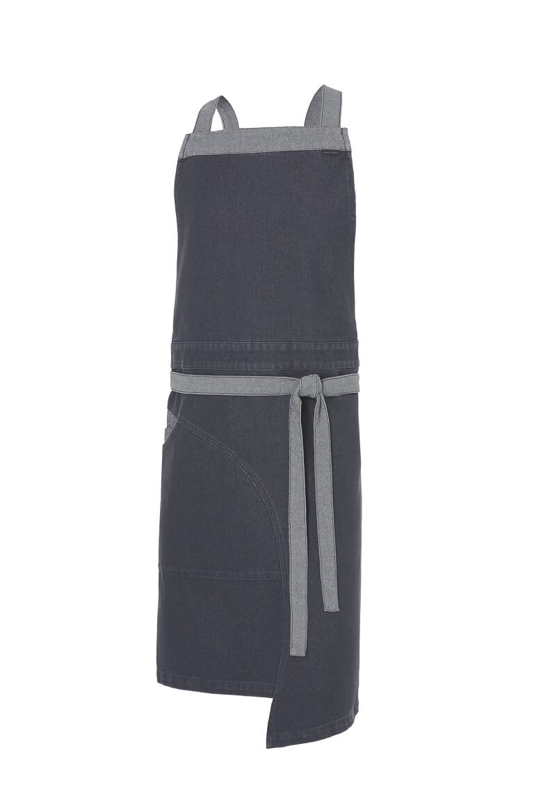 Confeccionado en tejido denim, este delantal con peto que está disponible en tres colores, está creado para coronar la uniformidad de los locales con el espíritu más urbano.
