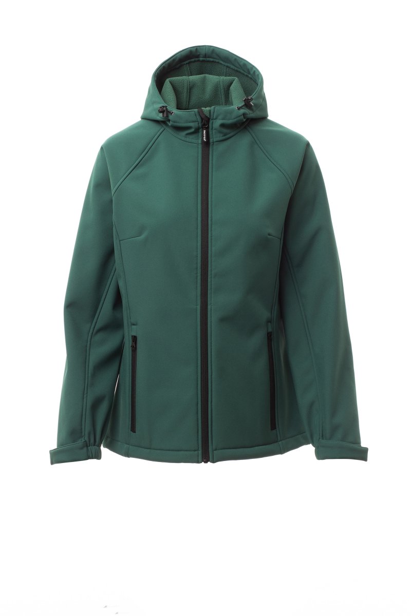 Soft-shell de tres capas, de mujer, manga raglán, cierre de cremallera SBS con cinta y cursor de metal. Capucha contorneada con dos costuras y cordón con tope. Puños elásticos ajustables con cierre de gancho y bucle. Dos bolsillos exteriores con cremallera.