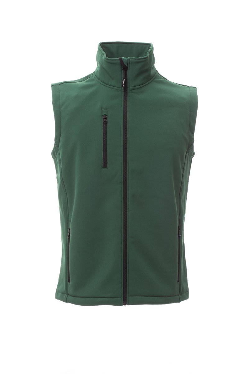 soft-shell de dos capas, con tratamiento repelente al agua, cierre de cremallera SBS con cinta. Dos bolsillos laterales y uno en el pecho con cremallera. Cintura con cordón.
