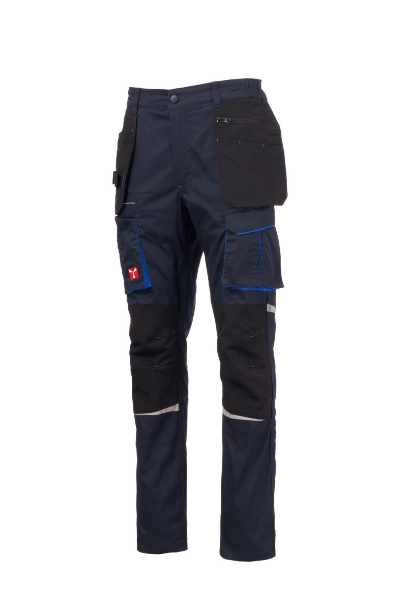 Pantalón unisex elástico, para todo el año, con elásticos laterales y trabillas en la cintura, cierre con cremallera y botón personalizado. Dos bolsillos flotantes en Nylon Oxford 500D, insertados en la cintura: uno con compartimento para bolígrafos y cinta para herramientas; otro con cremallera y compartimentos para guardar herramientas. En el delantero tiene dos bolsillos contorneados, un bolsillo pequeño para monedas a la derecha y un bolsillo pequeño de seguridad cerrado con cremallera a la izquierda. En la parte delantera de la pernera izquierda presenta un bolsillo con fuelle, tapeta con cierre de gancho y bucle y soporte para tarjeta de identificación. En la parte delantera de la pernera derecha presenta un bolsillo para el teléfono móvil con borde retrorreflectante y un bolsillo con fuelle. Ambas perneras disponen de bolsillos para rodilleras en Nylon Oxford 500D de tejido en contraste con apertura por la parte inferior y de inserciones retrorreflectantes. En la parte trasera presenta un bolsillo con tapeta y cierre de gancho y bucle (pernera izquierda), un bolsillo abierto con dos bandas retrorreflectantes y un bolsillo para el metro (pernera derecha); inserciones retrorreflectantes a la altura de la rodilla y cinta talonera de tejido en contraste (ambas perneras). También presenta costuras de triple aguja en la entrepierna y en el interior y exterior de la pernera, y costuras de refuerzo en contraste en distintos puntos. En las tallas (italianas) centrales 48-50-52, el interior de la pernera tiene una longitud normal de 82 cm.