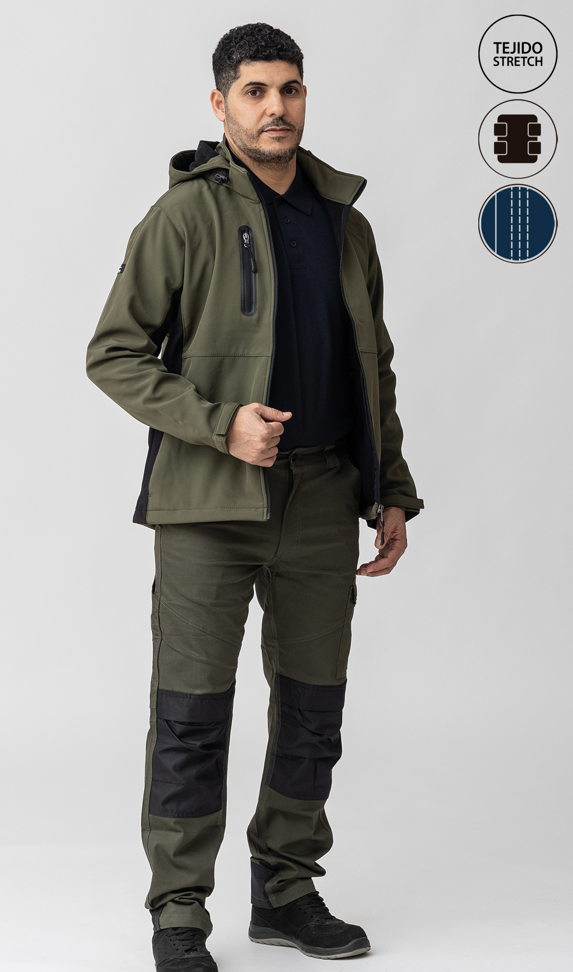 63% poliéster 34% algodón 3% elastano, 270 gr