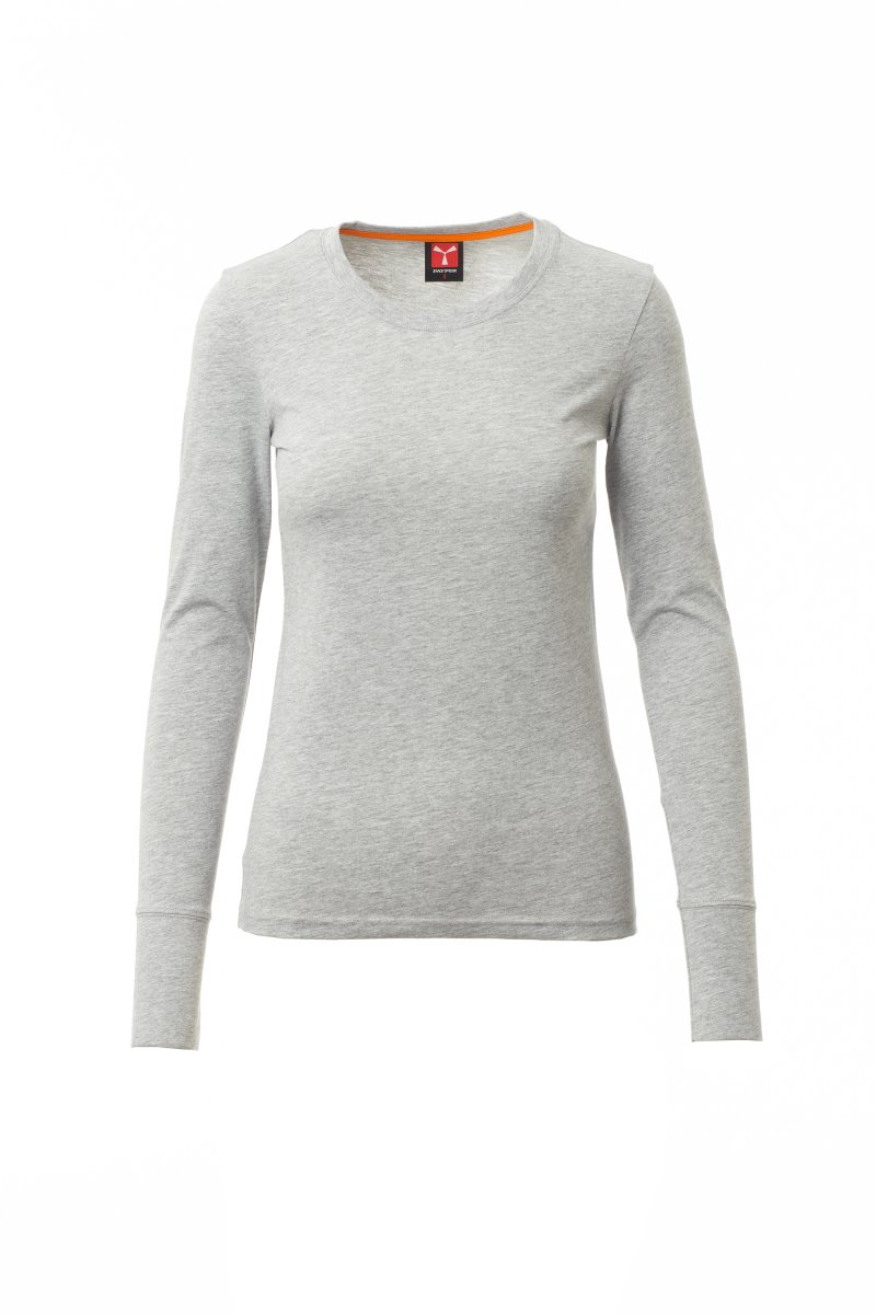 Camiseta ceñida de manga larga y cuello redondo para mujer, con banda elástica en cuello de elastano de 1,5 cm con pespunte superior en la parte delantera, puños largos, cinta de refuerzo de contraste de hombro a hombro visible en la parte interior del cuello, costuras elásticas, costuras laterales.