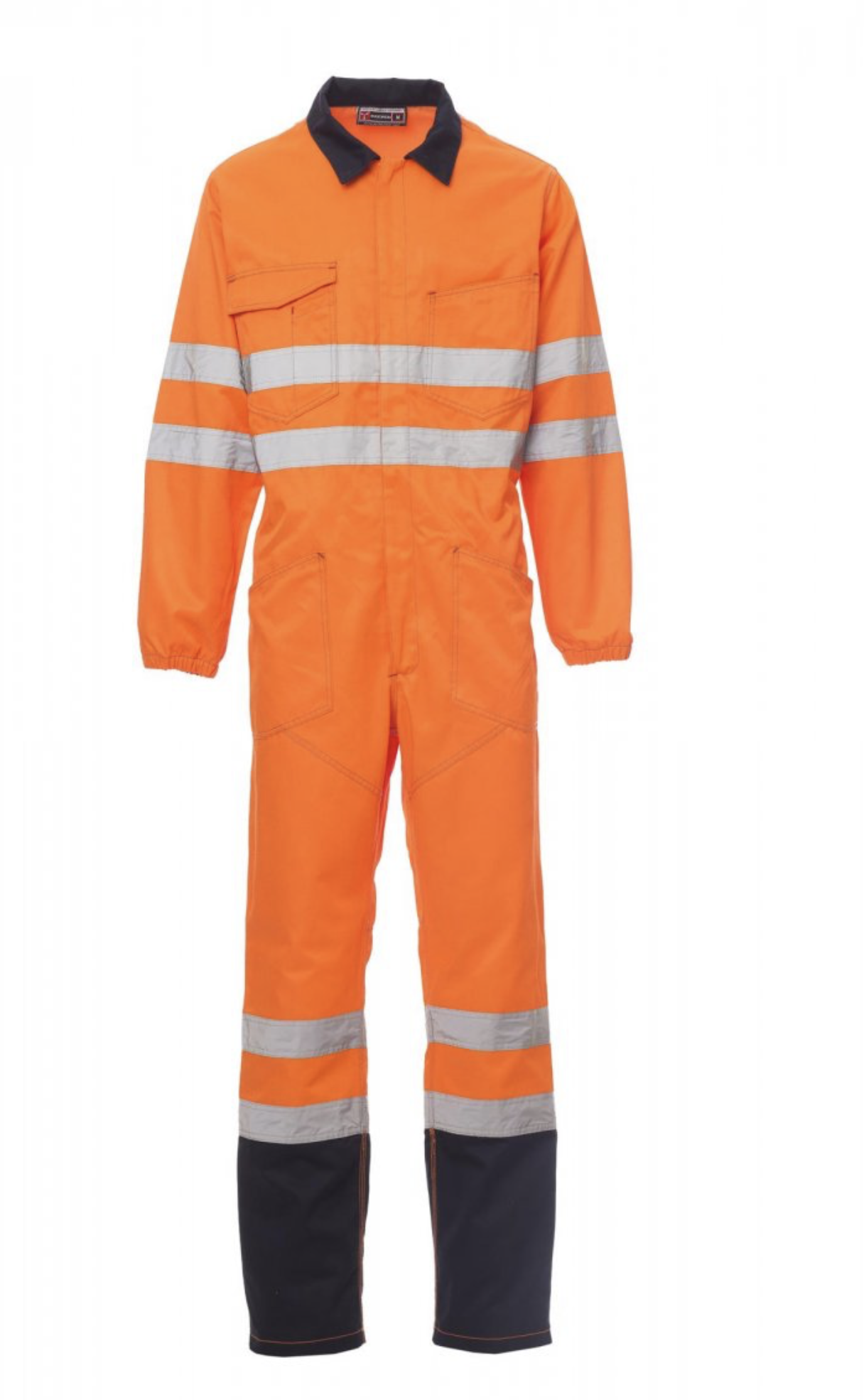 Mono de alta visibilidad con bandas retrorreflectantes, cremallera central cubierta de doble cursor, cintura con elástico en la parte posterior. Triple costura de refuerzo en la entrepierna y en la parte interior de la pierna. Dos amplios bolsillos de parche, dos bolsillos a la altura del pecho, uno de los cuales con tapeta y gancho para identificación personal, un soporte para bolígrafos, un bolsillo trasero con tapeta, soporte para metro lateral derecho. Puños con elásticos.