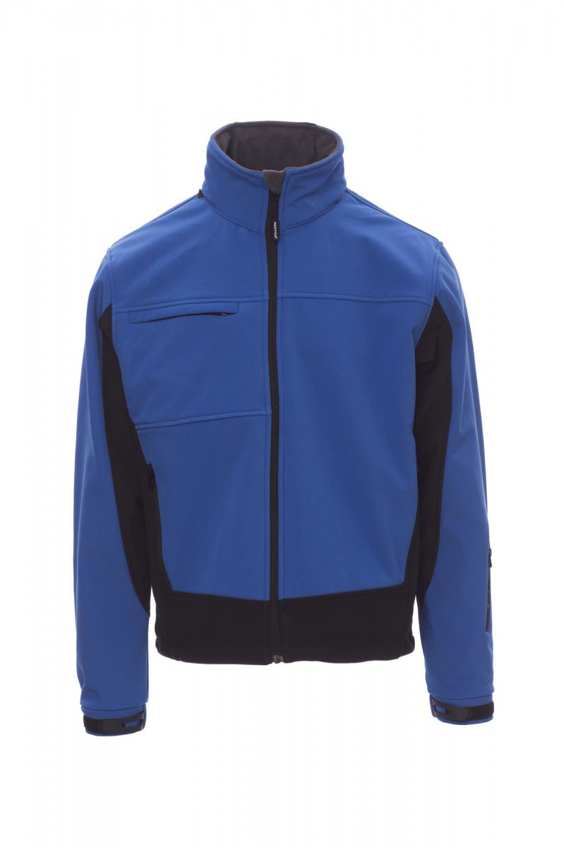 Soft-shell de tres capas, de hombre, bicolor. Cierre de cremallera SBS con cinta y capucha plegable en el cuello. Puños ajustables con cierre de goma y de gancho y bucle. Dos bolsillos laterales con cremallera, un bolsillo a la altura del pecho con soporte para tarjeta de identificación escamoteable, un bolsillo para forfait en la manga, cintura con cordón.