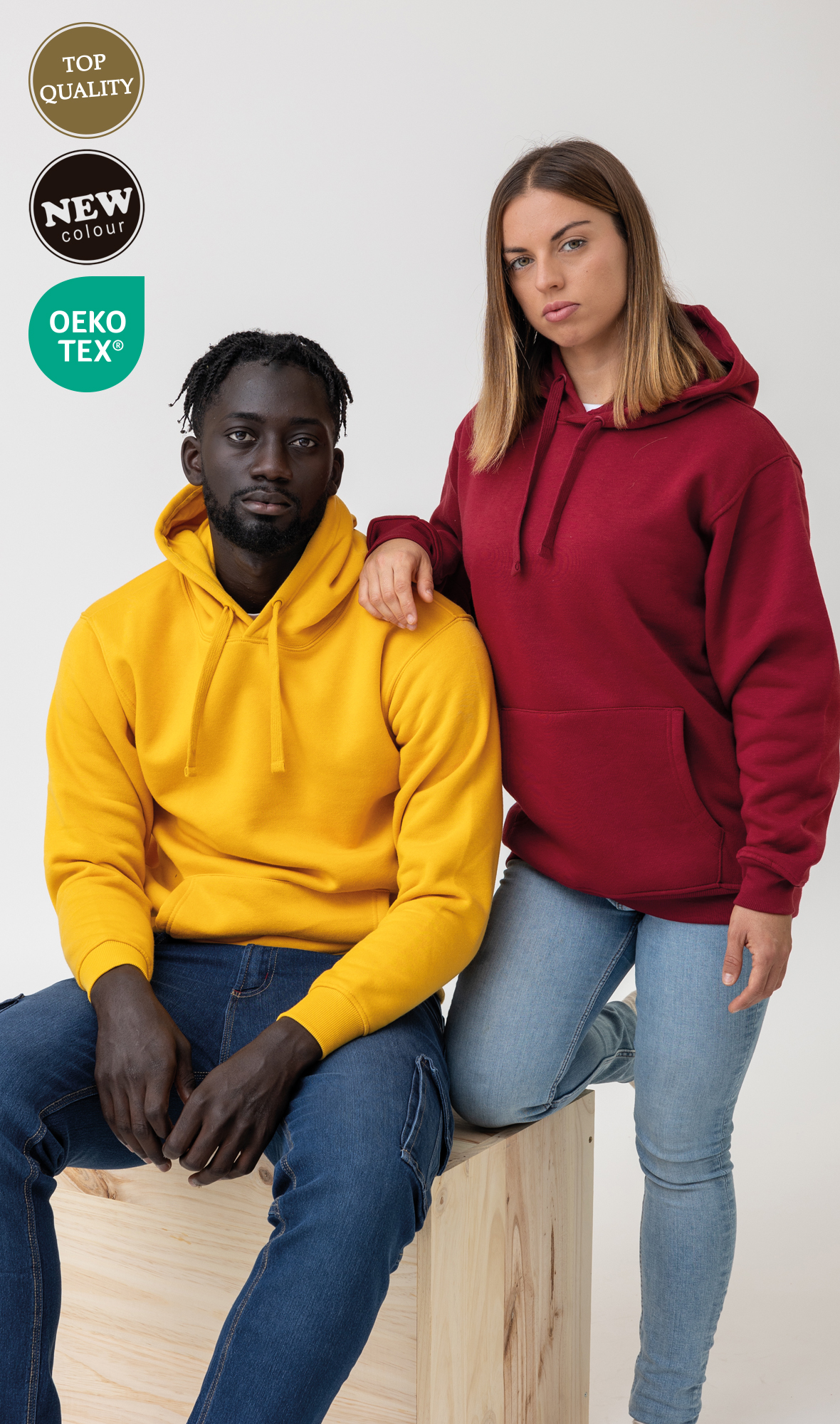 65% poliéster 35% algodón, 280 gr, felpa lisa perchada Capucha forrada con cordón ajustable con ojales metálicos Bolsillo canguro Canalé en cintura y puños