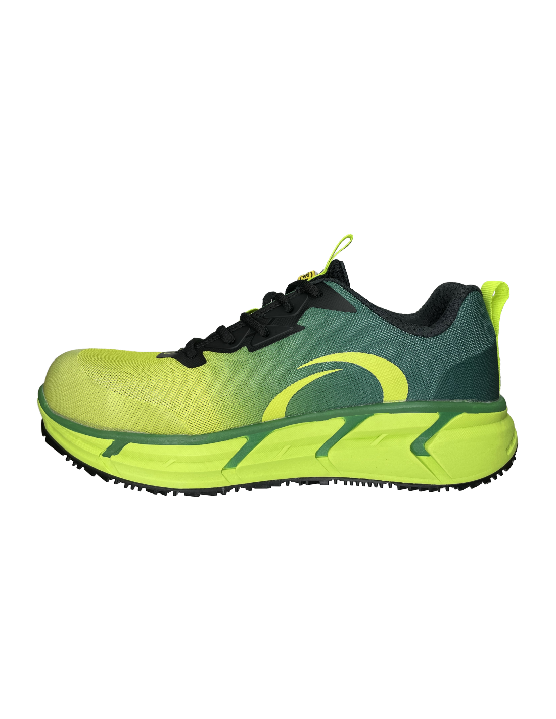 Zapato deportivo de seguridad S1P fabricado en rejilla transpirable. Refuerzos de TPU en zona de puntera, trasera y cordonera